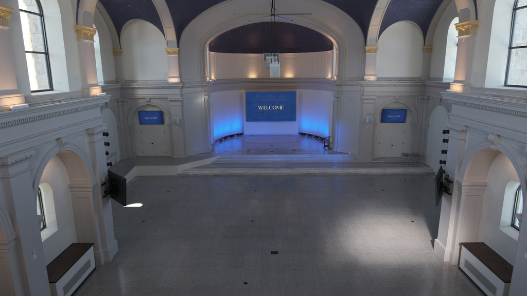 Transforming the former Annunciation Catholic Church required meticulous care to honor its cultural and historical significance for Kansas City's East Side. The 43-foot vaulted ceiling, plaster walls, stained-glass windows, and ornate crown molding presented substantial acoustic challenges, as the reflective surfaces could create echoes, feedback, and uneven coverage.